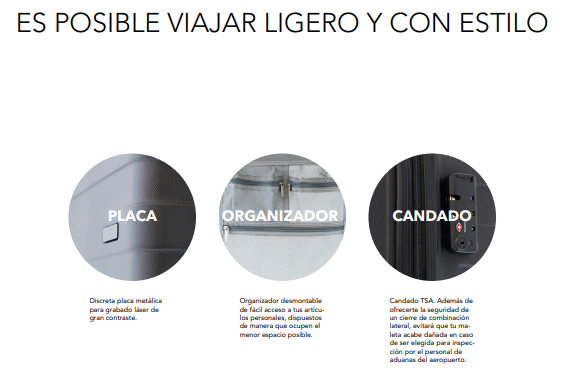 Plástico resistente al impacto. Bastón de aluminio reforzado de doble altura. 4 Ruedas de alto impacto con suave giro 360°. Candado TSA (Transportation Security Administration). División de espacios optimizada gracias a su organizador con multi compartimentos desmontable. Peso: 3.06 Kg. Capacidad: 41.4 Litros. Terminado texturizado negro mate.